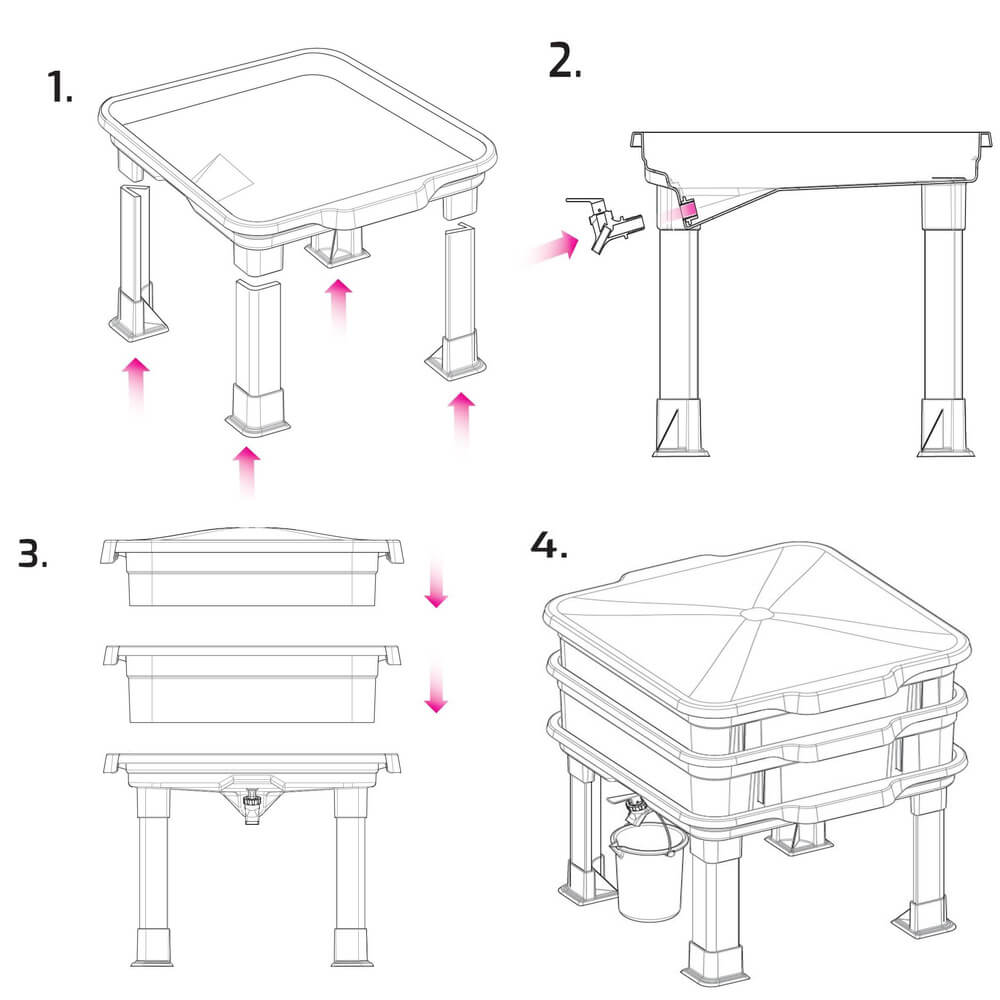 Compact layered wormery with tap for draining liquid feed