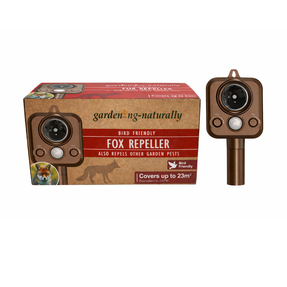 The unit uses a PIR motion sensor to detect warm movement within its range. When activated it sends out high frequency sound that is unpleasant for foxes but safe for humans. This targeted approach helps save battery power and reduces the chance of foxes becoming used to the sound. The design is bird friendly and does not affect feeding or bathing areas.