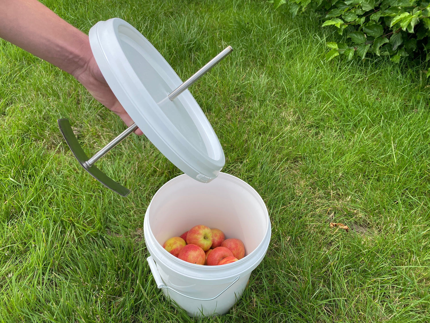 The integrated stainless steel blade ensures fruit is chopped evenly and quickly. Once fitted inside the food-safe bucket and lid, the blade transforms halved fruit into pomace suitable for pressing. The secure lid helps contain splatter and keeps the process clean.