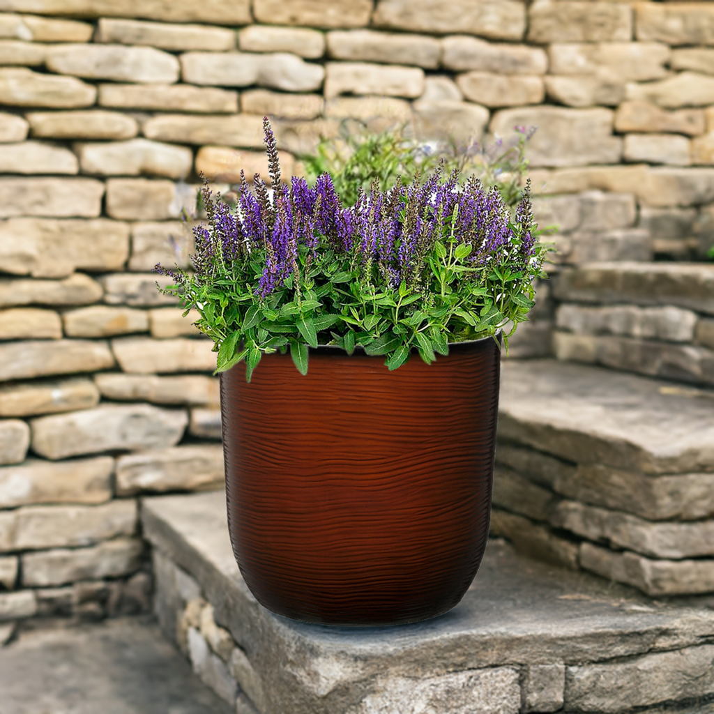 These recycled ceramic finish plant pots are designed to mimic the look of natural clay with a glazed ceramic finish while being crafted from 100% recycled plastic. This pot is intended for both indoor and outdoor plant display, offering the classic charm of ceramic without the maintenance or fragility.