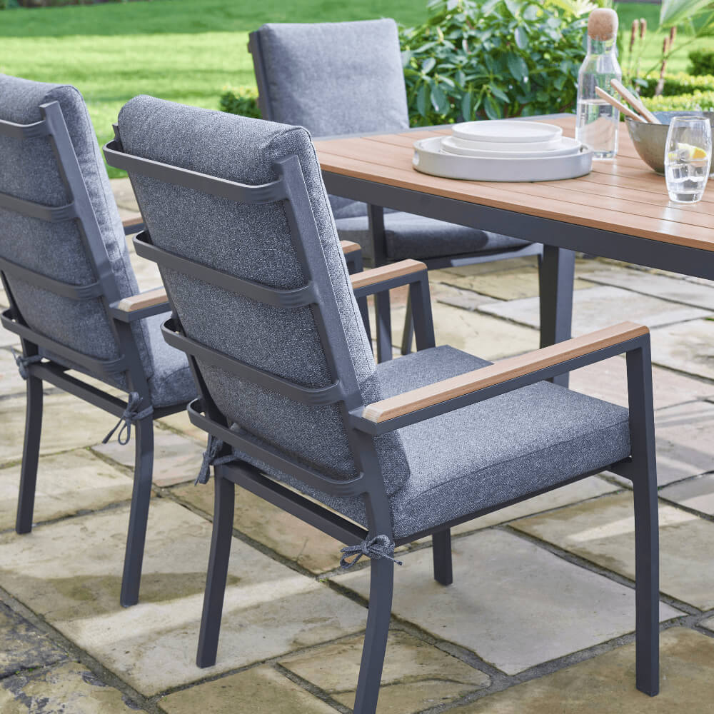 The dining set boasts a contemporary look with its powder-coated anthracite aluminium frames, adding a touch of modern elegance. These frames are corrosion-resistant, ensuring long-lasting performance for years to come.