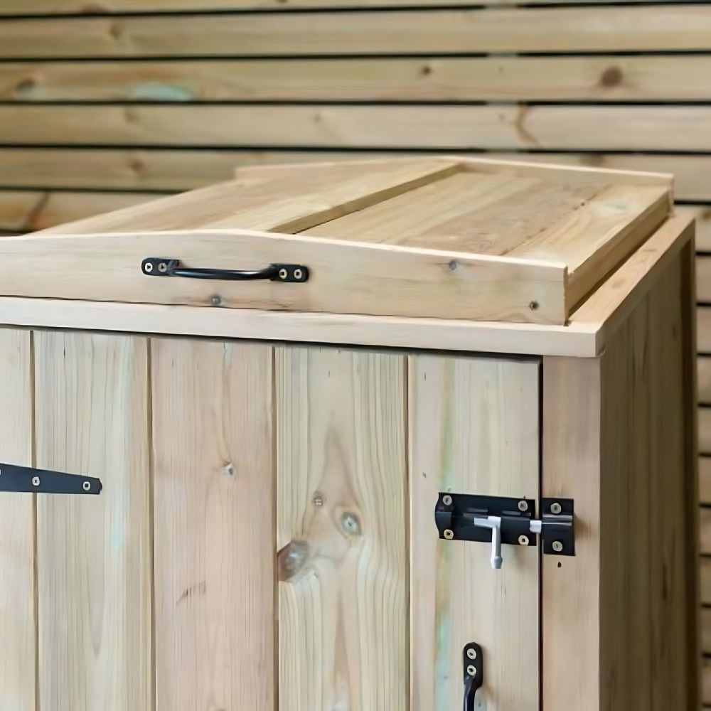 Each storage cupboard is made in Lancashire, UK, from pressure-treated wood. They keep kerbside bins tidy and out of sight.