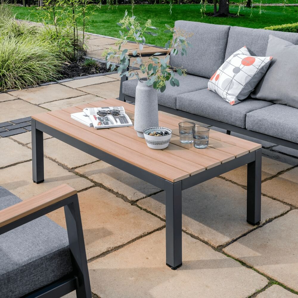 The teak-look polywood in this set offers the beautiful aesthetic of teak wood without the high maintenance. It's resistant to fading, cracking, and splintering, making it perfect for British weather. The 4 piece lounge set is the perfect addition to your outdoor space, combining style, comfort, and low maintenance.