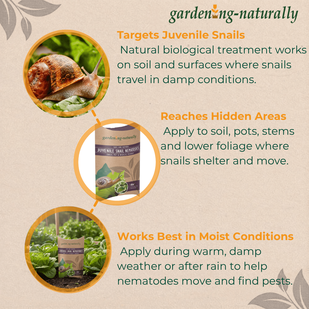 This treatment is used for biological control of juvenile snails in garden areas. It works when applied to moist soil or surfaces that snails move across and can also reach pests that shelter close to the ground or around pots when conditions are damp.